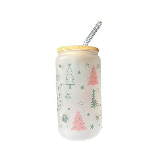 Christmas Trees Sublimated 16oz Frosted Libbey Glass Can with Bamboo Lid and reusable glass straw