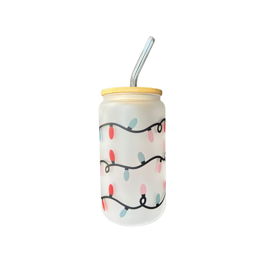 Christmas Lights Sublimated 16oz Frosted Libbey Glass Can with Bamboo Lid and reusable glass straw