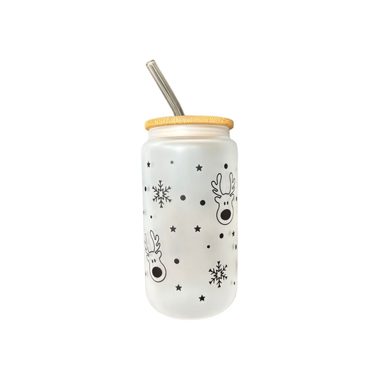 Reindeer Sublimated 16oz Frosted Libbey Glass Can with Bamboo Lid and reusable glass straw