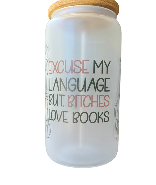 Excuse My Language Sublimated 16oz Frosted Libbey Glass Can with Bamboo Lid and reusable straw.