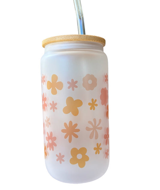 Colourful Flowers Sublimated 16oz Frosted Libbey Glass Can with Bamboo Lid and reusable straw.