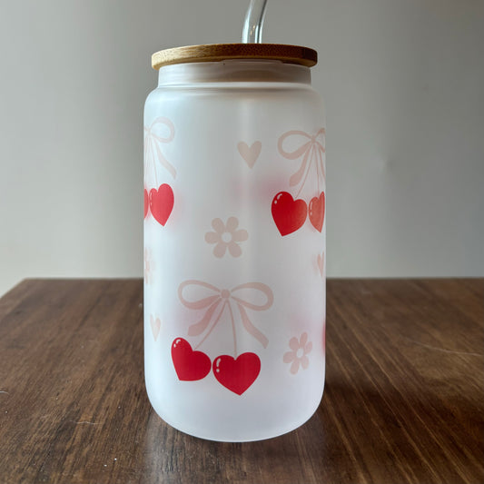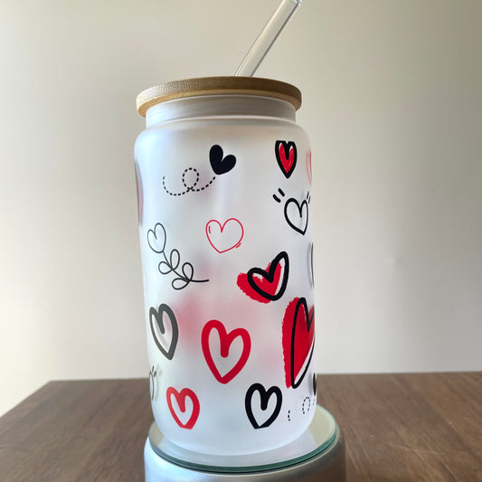 Hearts Sublimated 16oz Frosted Libbey Glass Can with Bamboo Lid and reusable straw.