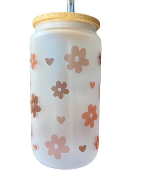 Flowers and Hearts Sublimated 16oz Frosted Libbey Glass Can with Bamboo Lid and reusable straw.