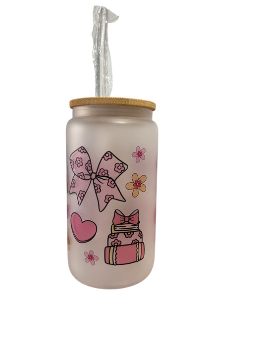 Fun Coquette Sublimated 16oz Frosted Libbey Glass Can with Bamboo Lid and reusable straw.