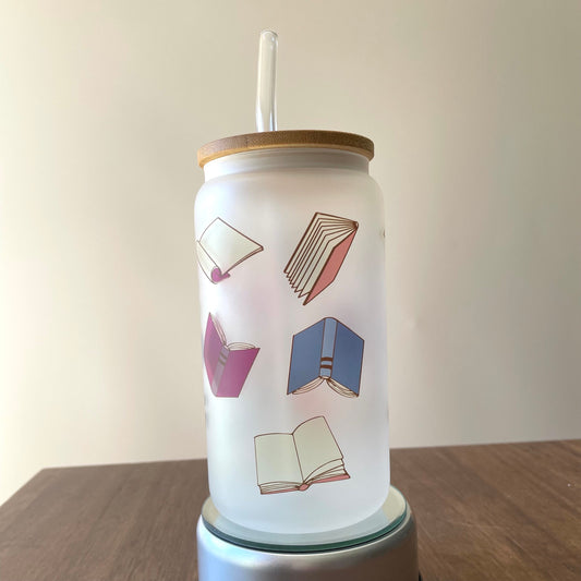 Just One More Chapter Sublimated 16oz Frosted Libbey Glass Can with Bamboo Lid and reusable straw.