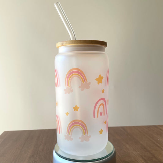 Rainbows Sublimated 16oz Frosted Libbey Glass Can with Bamboo Lid and reusable straw.