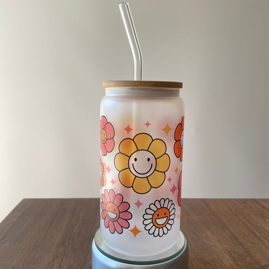 Flowers with Faces Sublimated 16oz Frosted Libbey Glass Can with Bamboo Lid and reusable straw.