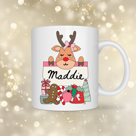 Christmas Themed White Ceramic Mugs 11oz or 15oz, personalise with name, reindeer, gingerbread man, boy or girl, baubles, present, gift