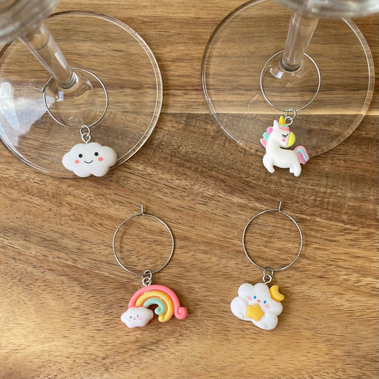 Rainbows and Unicorns Silver 25mm Wine Glass Charm Rings with Resin Charms