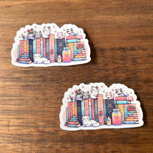 Cats on Bookshelf Vinyl Die Cut Laminated Sticker