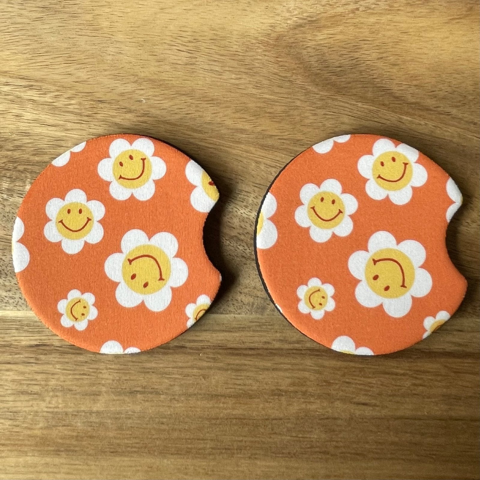 White Flowers on Terracotta Car Coasters Pack of 2, Cup Holder Coasters